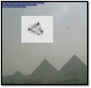 Very clear, distinctive, silvery UFOs were photographed in March and November 2006, January and March 2007, September 2008, and April and November 2009 in both daylight and darkness. Separate tourist photos show obvious UFOs in April 2004, July 2005, June 2010, July 2013, 2014, March and April 2016, 2018, March 2019, and July 2020. One particularly stunning photo taken in July 2013 very plainly shows a black triangular craft with rounded edges and three belly lights very close to the Great Pyramid. Indeed, the city of Cairo’s official name is al-Qāhirah, which means: “Place (or City) of Mars.”