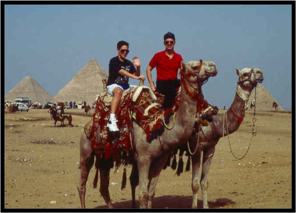 Author (in red shirt) and son at the Pyramids, 1995.