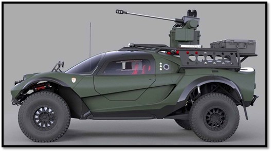 The Glickenhaus 008 Fast-Response, Military Vehicle concept car shown above is depicted with a notional, roof-mounted, remote-control (RC) cannon, which closely resembles the new, British-made, AEI Systems, Ltd., Venom LR (Low-Recoil), 30mm cannon. But the stainless-steel barrel in the photos is too thin, and the twin recoil buffers are missing, so this appears to be a representative, RC weapon, simply to display the military character of this off-road supercar! Glickenhaus has also revealed that they have fire-department and law-enforcement versions expected to follow behind this amazing vehicle in the near future. While it remains to be seen if there are any actual orders, this is an exceptional technology demonstrator for ultra-modern, fast-attack vehicles!
